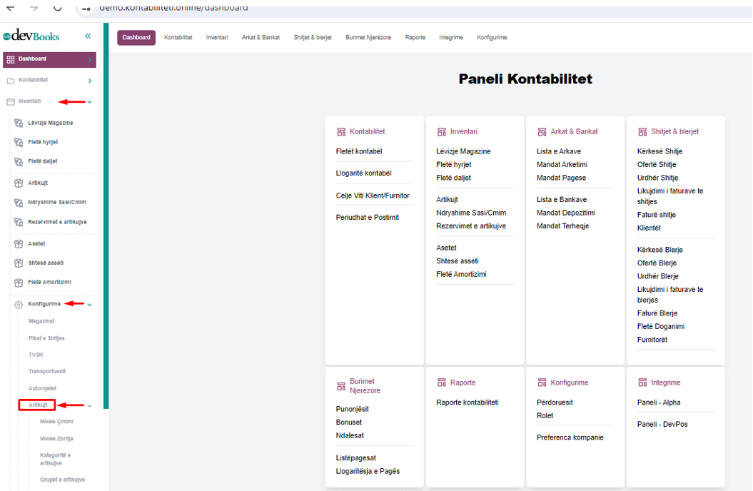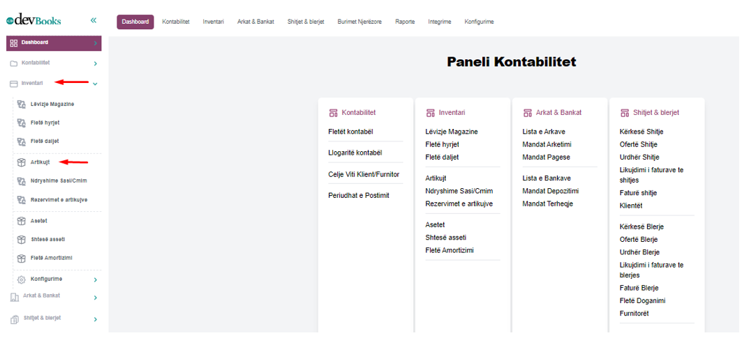 Klikoni në modulin Inventari, në menunë Konfigurime, më pas klikoni nënmenunë Artikujt.
