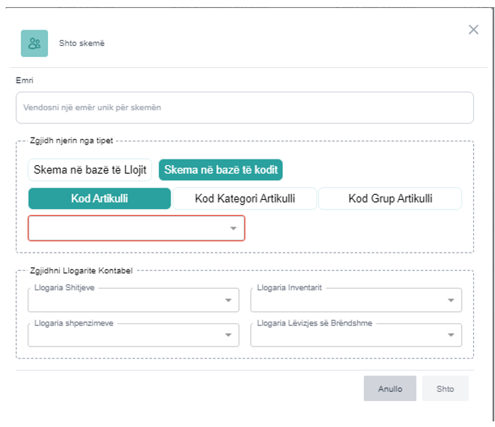 Për çdo artikull duhet të përcaktohet skema e llogarive kontabël, që do të thotë që për secilin prej tyre duhet të specifikohen llogaritë të cilat do të preken në momentin që kryhet një veprim me artikullin.