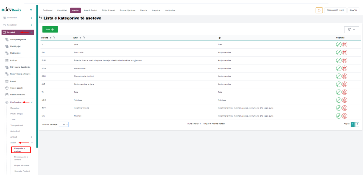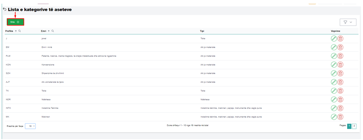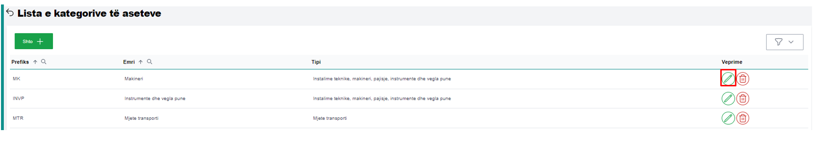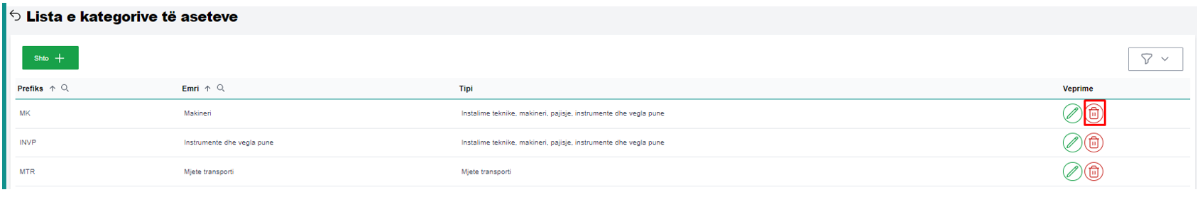 Në ekran do t’ju shfaqet lista me të gjithe kategorite e aseteve te shtuar në sistem. Për të shtuar një kategori aseti te ri klikoni në butonin Shto.