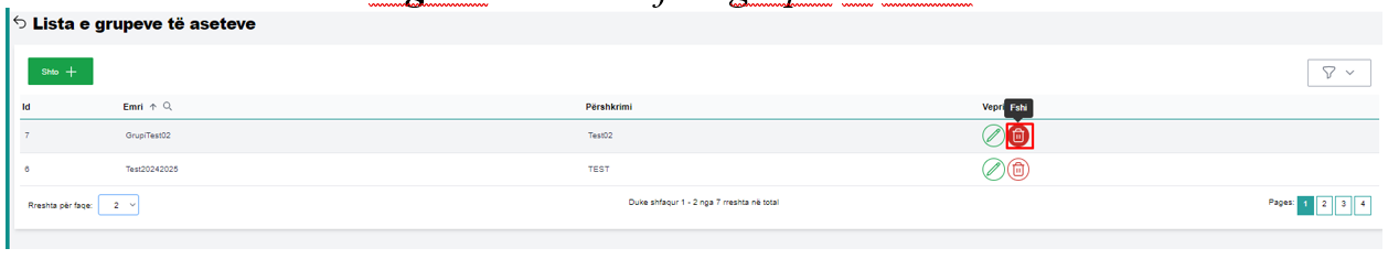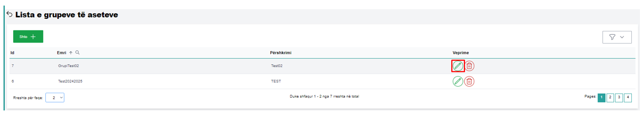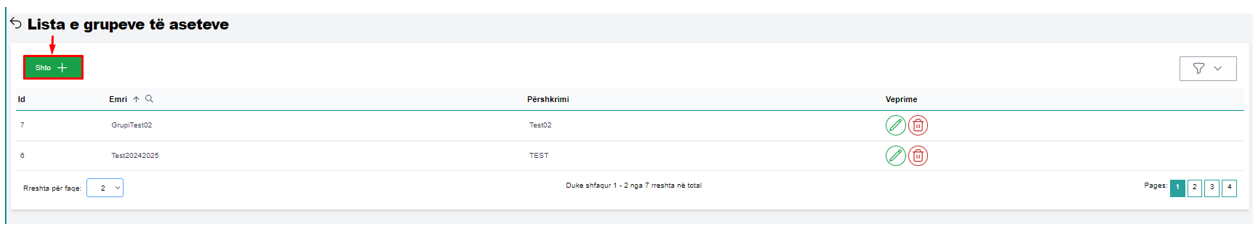 Në ekran do t’ju shfaqet lista me të gjithe grupet e aseteve te shtuar në sistem. Për të shtuar një grup aseti te ri klikoni në butonin Shto.