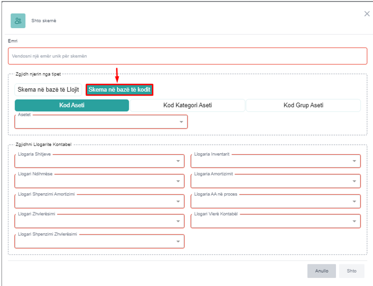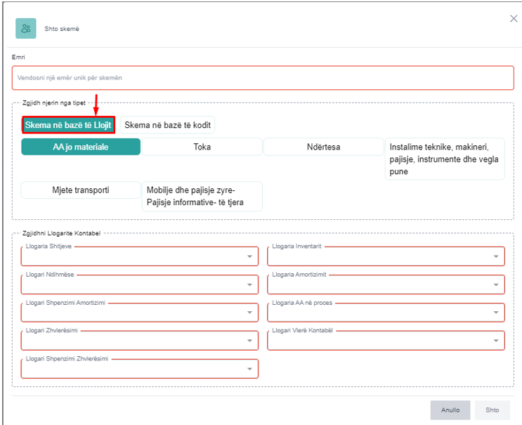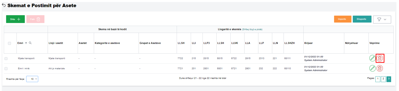 Në ekran do t’ju shfaqet lista me të gjithe skemat e postimit te shtuar në sistem per asetet.Për të shtuar një skeme postimi te ri klikoni në butonin Shto.