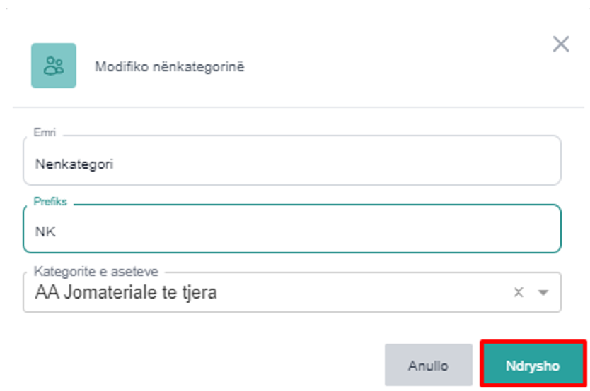 Për të edituar një nenkategori aseti klikoni butonin Ndrysho (fig 112). Modifikoni të dhënat dhe më pas klikoni në butonin Ndrysho sipas figures se meposhtme.