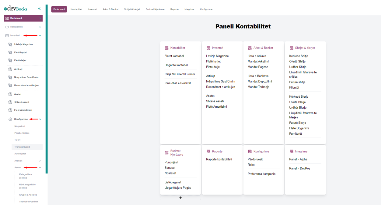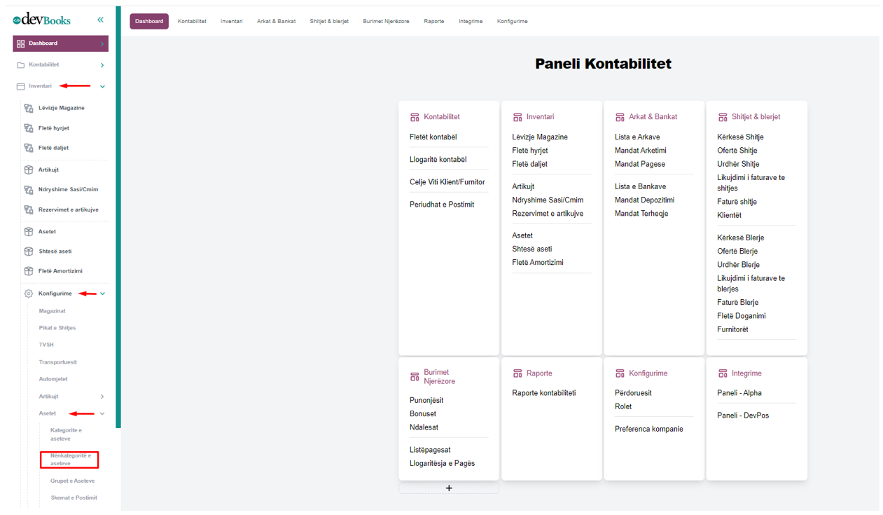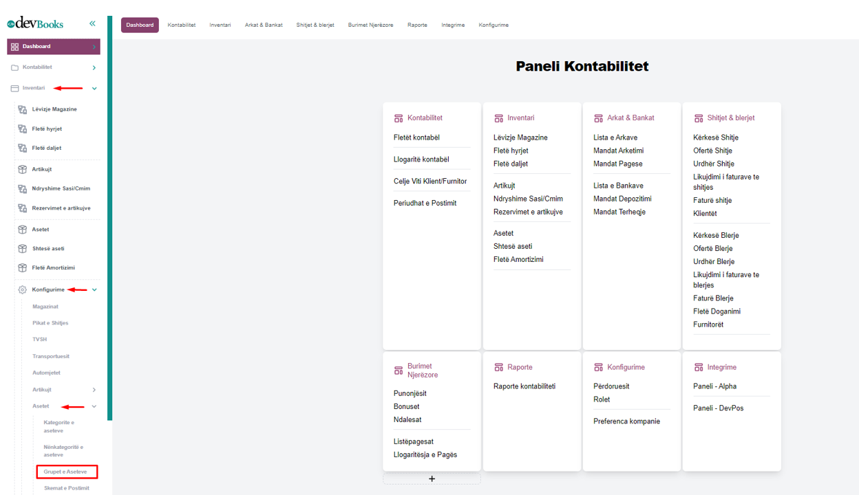 Klikoni ne modulin Inventari, në menunë Konfigurime, më pas klikoni nënmenunë Asetet.