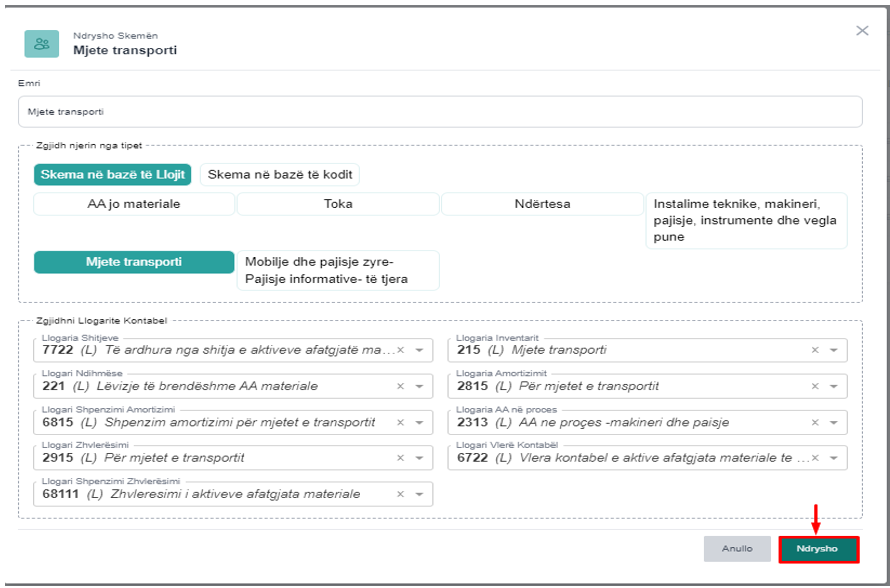 Për të edituar një kategori aseti klikoni butonin Ndrysho (fig 106). Modifikoni të dhënat dhe më pas klikoni në butonin Ndrysho (fig 107).