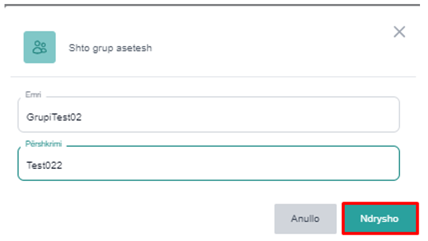 Për të edituar një grup aseti klikoni butonin Ndrysho (fig 118). Modifikoni të dhënat dhe më pas klikoni në butonin Ndrysho(fig 119).