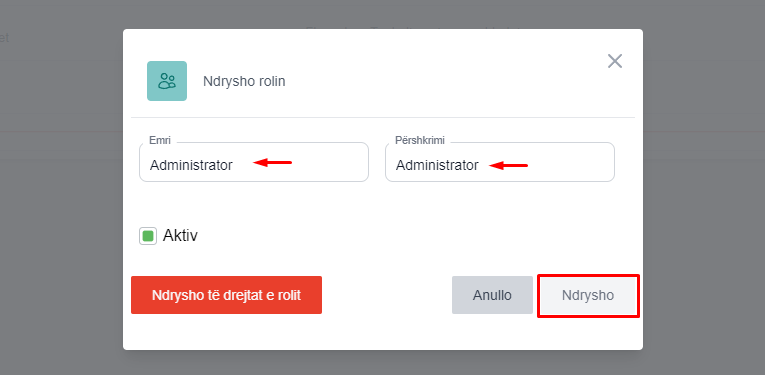 Për të edituar të dhënat e një roli të regjistruar në sistem, përzgjidhni rolin që do të modifikoni dhe klikoni butonin Ndrysho. (fig 11)