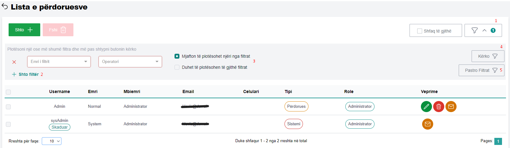Për të filtruar listën klikoni në butonin Filtro (1). Pasi të keni klikuar butonin filtro do t'ju shfaqet mundësia për të shtuar filtër duke klikuar në butonin Shto filtër (2). Për filtrat e shtuar mund të zgjidhni njërin nga opsionet Mjafton të plotësohet njëri nga filtrat/ Duhet të plotësohen të gjithë filtrat (3) (fig 17)