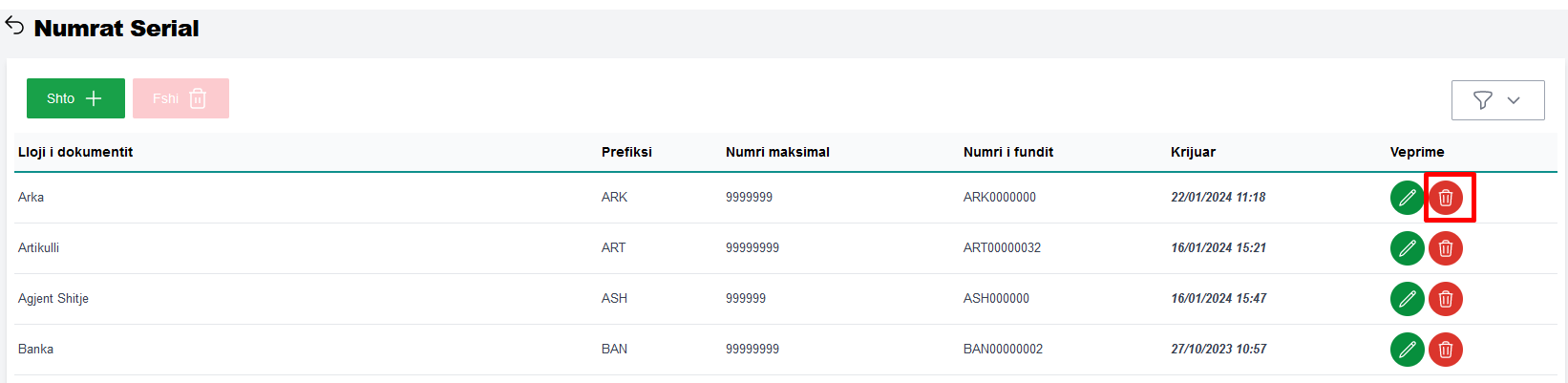Për të fshirë një numër serial nga sistemi duhet të klikoni në butonin Fshi. (fig 34)