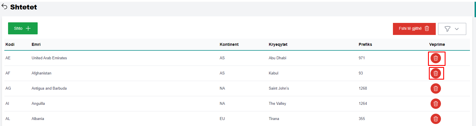 Për të fshirë një shtet nga lista e shteteve të konfiguruar në sistem, përzgjidhni shtetin që doni të fshini dhe më pas klikoni në butonin Fshi (fig 24).