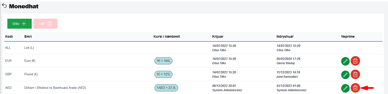 Monedha nuk mund të fshihet nga sistemi nëse është përdorur më parë në veprime të tjera!