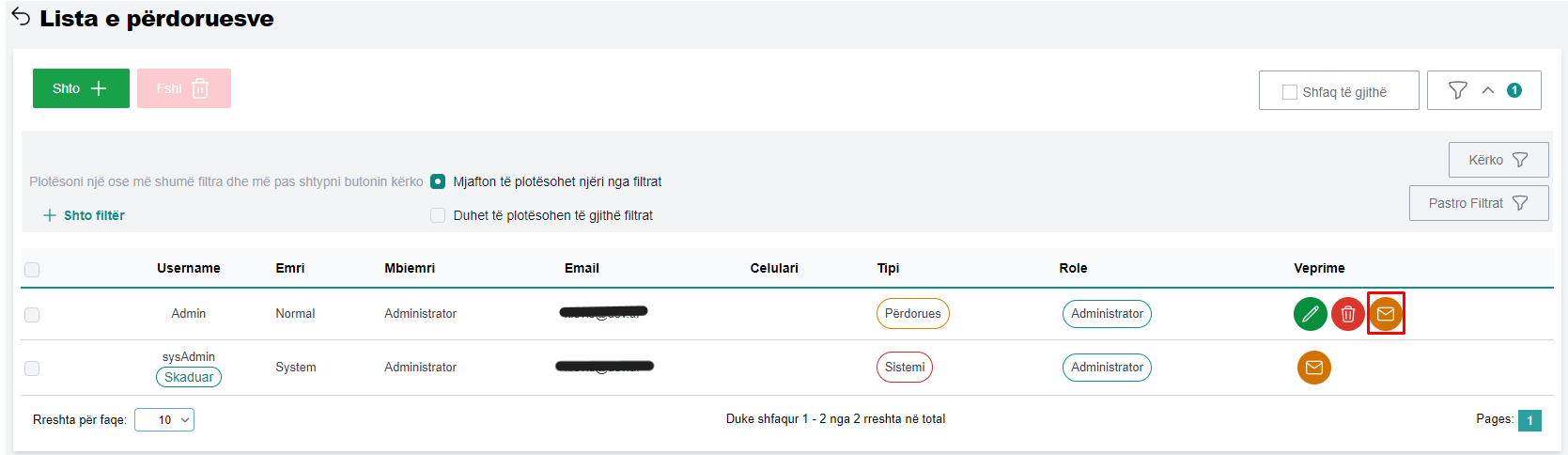 Përdoruesi mund te ndryshojë fjalëkalimin nëpërmjet linkut të gjeneruar në adresën e email-it. Për të gjeneruar linkun përzgjidhni përdoruesin që do të ndryshojë fjalëkalimin dhe klikoni në butonin Gjenero email për ndryshimin e fjalëkalimit (fig 18).