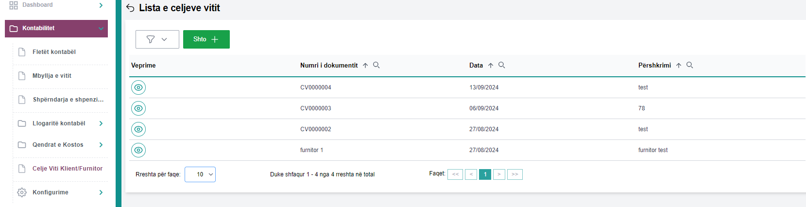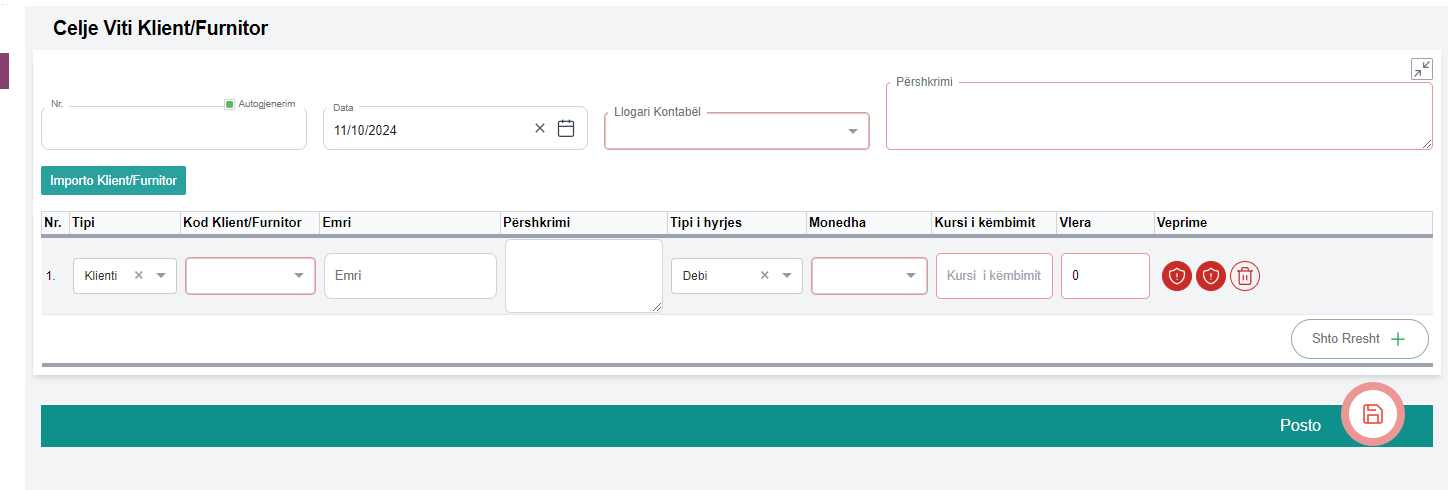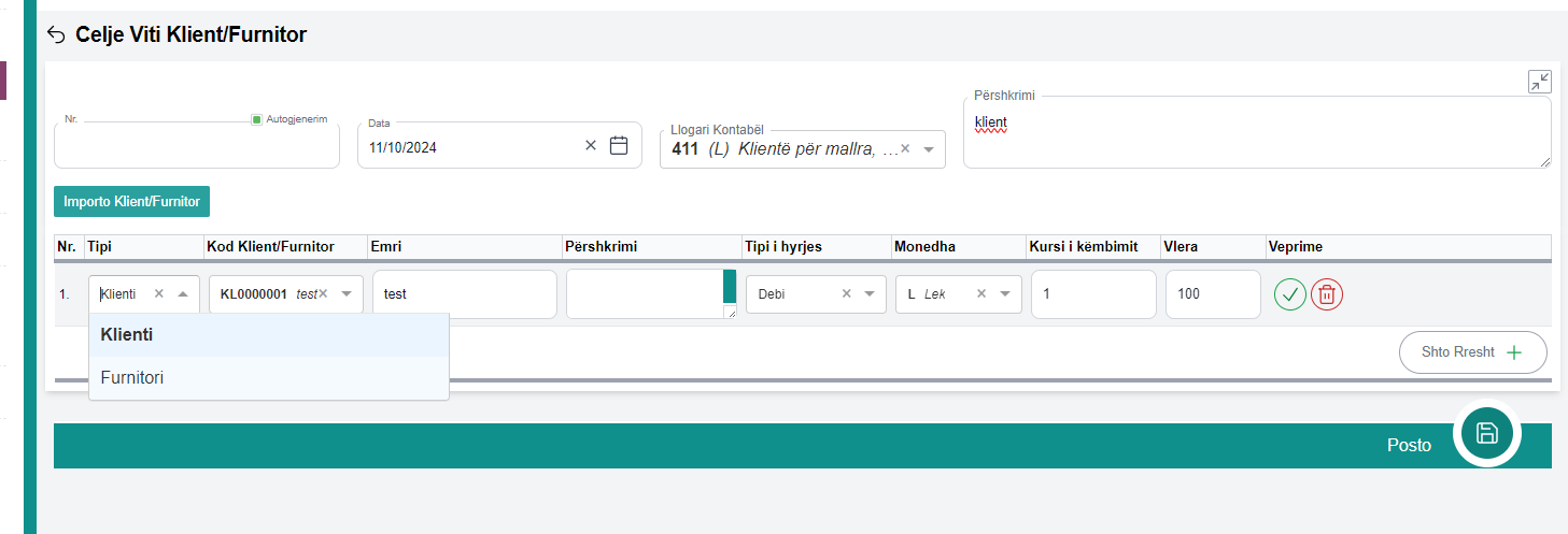 Pas plotësimit si në shembull, (e njëjta gjë dhe për rastin e furnitorit) klikojmë ‘Posto’ dhe dokumenti do të na shfaqet në listën e celjeve të vitit.