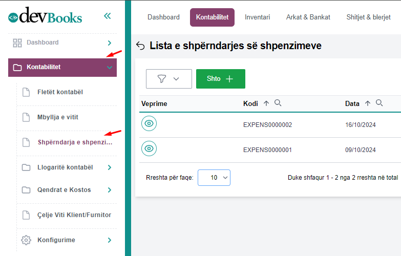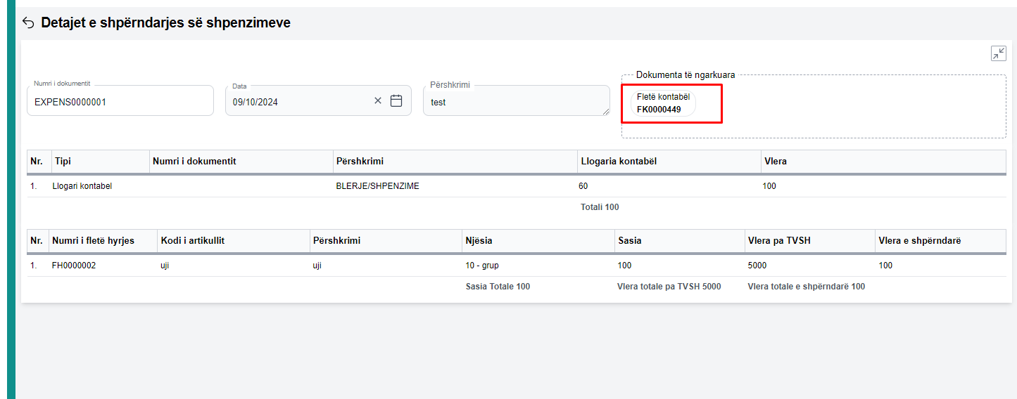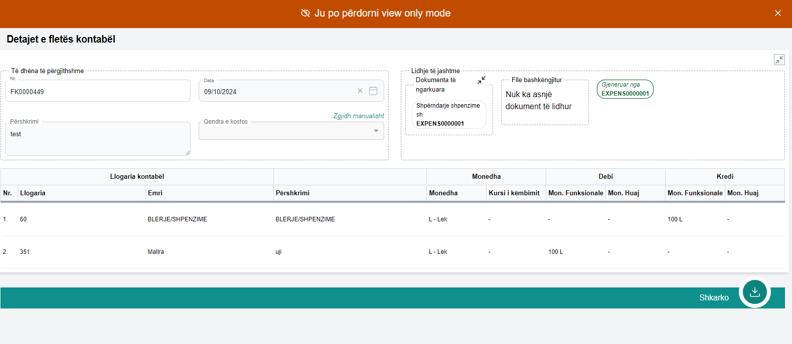Pasi kemi krijuar dokumentin dhe e kemi ruajtur me anë të butonit ‘Shiko’ klikojmë dhe shohim detajet e dokumentit të krijuar. Së bashku me të është krijuar dhe fleta kontabël.