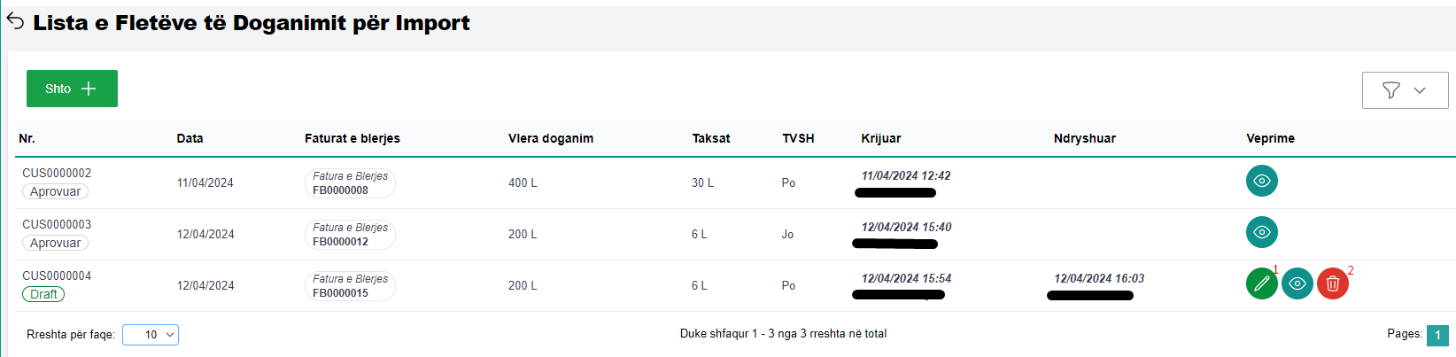 Ju mund të editoni të dhënat ose të fshini nga sistemi fatura doganimi të cilat ndodhen në statusin Draft. Për të edituar të dhënat e një fature doganimi ë statisin Draft, përzgjidhni faturën që do të modifikoni dhë më pasi klikoni butonin Ndrysho (1) (fig 2.2) . Pasi të keni modifikuar të dhënat klikoni butonin Ruaj. Për të fshirë një fature doganimi ë statisin Draft, përzgjidhni faturën që do të fshinini dhë më pasi klikoni butonin Fshi (2) (fig 2.2).