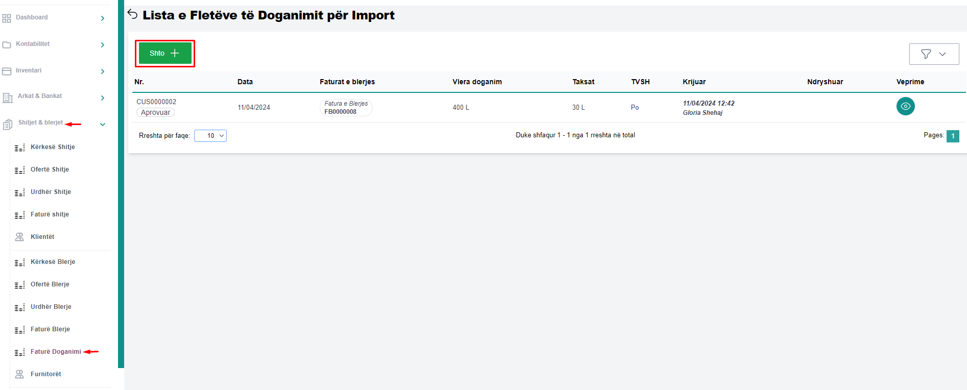 Për të shtuar një faturë doganimi klikoni menunë Shitjet & blerjet, përzgjidhni dhe klikoni nënmenunë Faturë Doganore, më pas klikoni butonin Shto (fig 1.1)