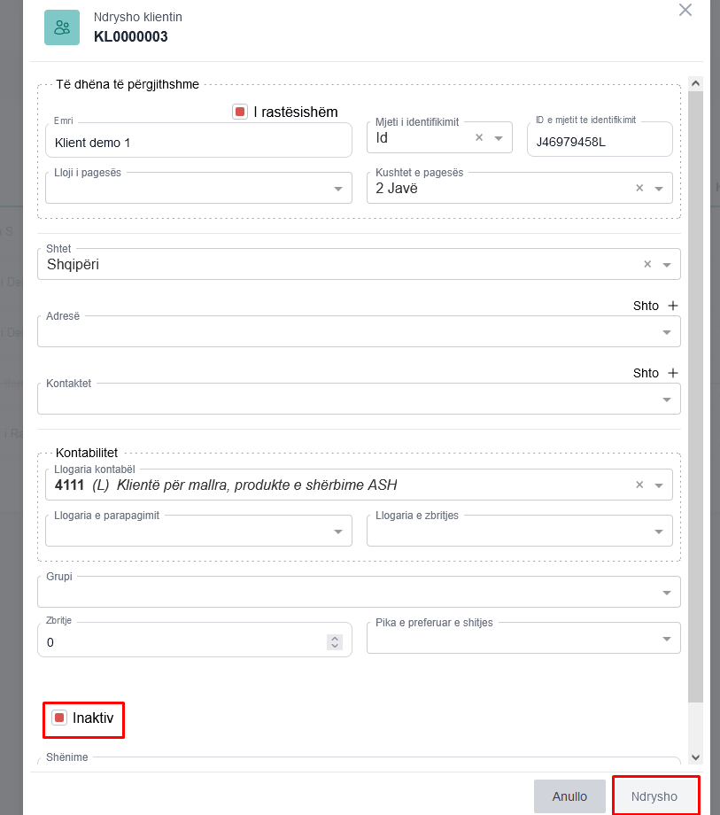 Për të riaktivizuar një klient të fshirë, klikoni butonin e editimit. Ne formën e hapur ndryshoni statusin e klientit duke e kthyer në aktiv (fig 5.2).
