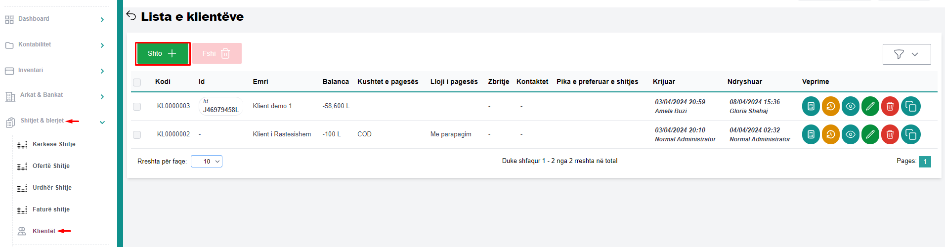 Për të shtuar një klient të ri klikoni menunë Shitje & blerjet, përzgjidhni dhe klikoni nënmenunë Klientet, më pas klikoni butonin Shto (fig 1.1).