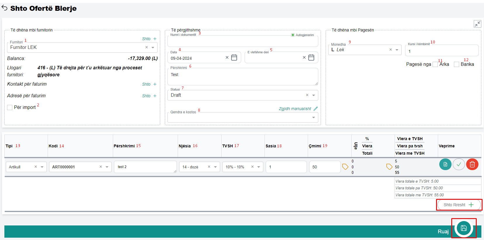 Shto rresht - klikoni butonin shto rresht nëse në ofertë doni të shtoni artikull ose llogari