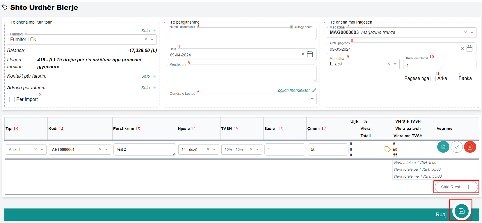 Shto rresht - nëse do duhet të shtoni llogri ose artikuj të tjerë në dokumentin Urdhër shitje klikoni butonin Shto rresht .