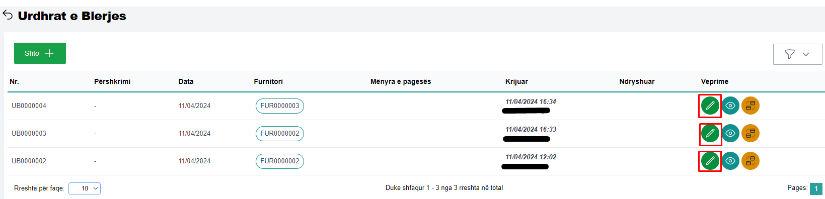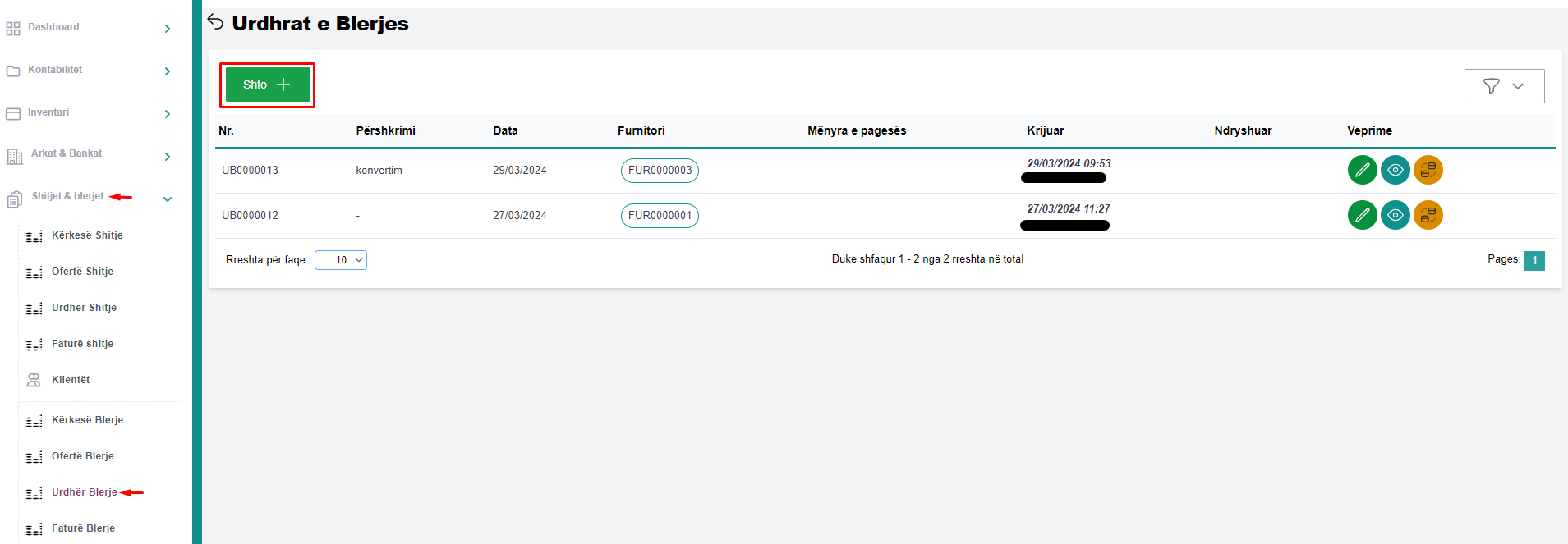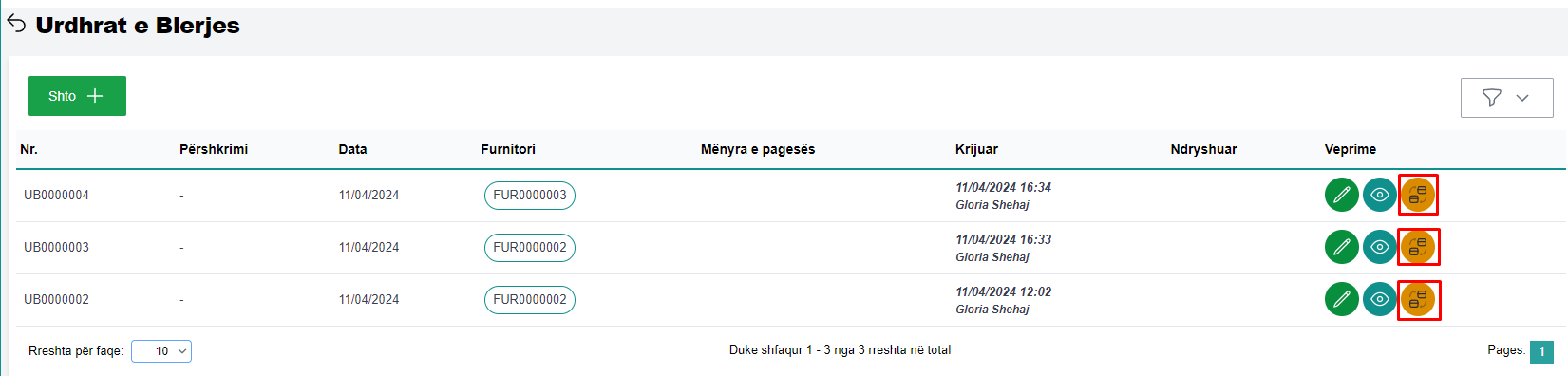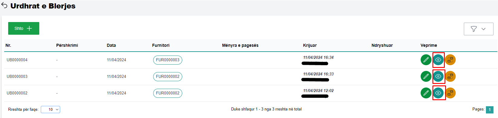 Për të kontrolluar të dhënat e regjistruara në një urdhër blerje, klikoni butonin Shiko (fig 3.1).